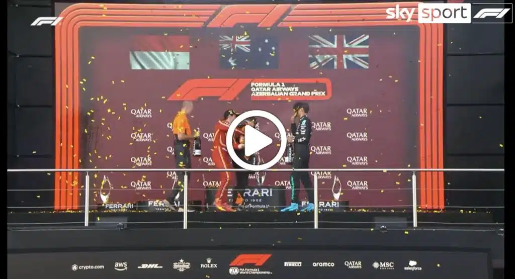 F1 | GP Azerbaijan, la festa sul podio a Baku di Piastri, Leclerc e Russell [VIDEO]