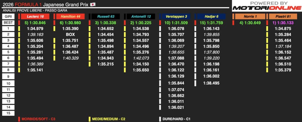 Kimi Antonelli ha concluso la sessione con il secondo tempo assoluto (1:30.225), ma è stato il suo lavoro sulla distanza a confermare la superiorità della sua monoposto. Equipaggiato con pneumatici di mescola Media (C2), il giovane pilota italiano ha mantenuto una costanza quasi millimetrica, facendo segnare una sequenza di passaggi sul 1:34 medio. In particolare, la progressione 1:34.5, 1:34.7 e 1:34.5 indica una gestione dello pneumatico e dell’energia ottimali. Il picco prestazionale è arrivato al settimo giro dello stint, quando a serbatoi ancora carichi Antonelli ha fermato il cronometro sull’1:34.150, un tempo che testimonia la bontà del progetto tecnico del team di Toto Wolff.